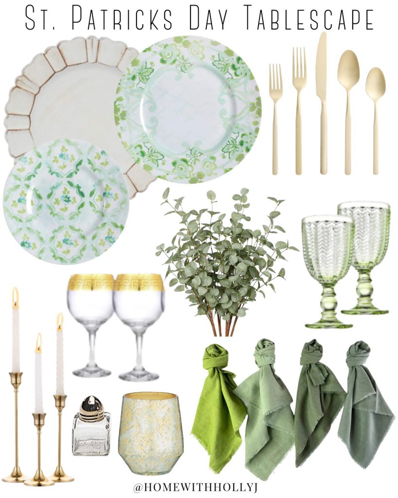The Easter sign was from Hobby Lobby but is no longer available. Here’s another option here. If you want decorations for your tablescape for St. Patricks Day, check for festive signs and decor.